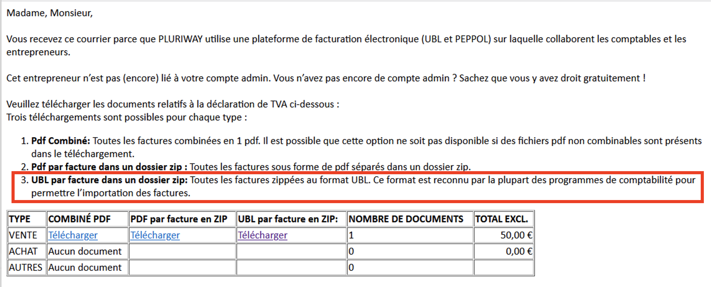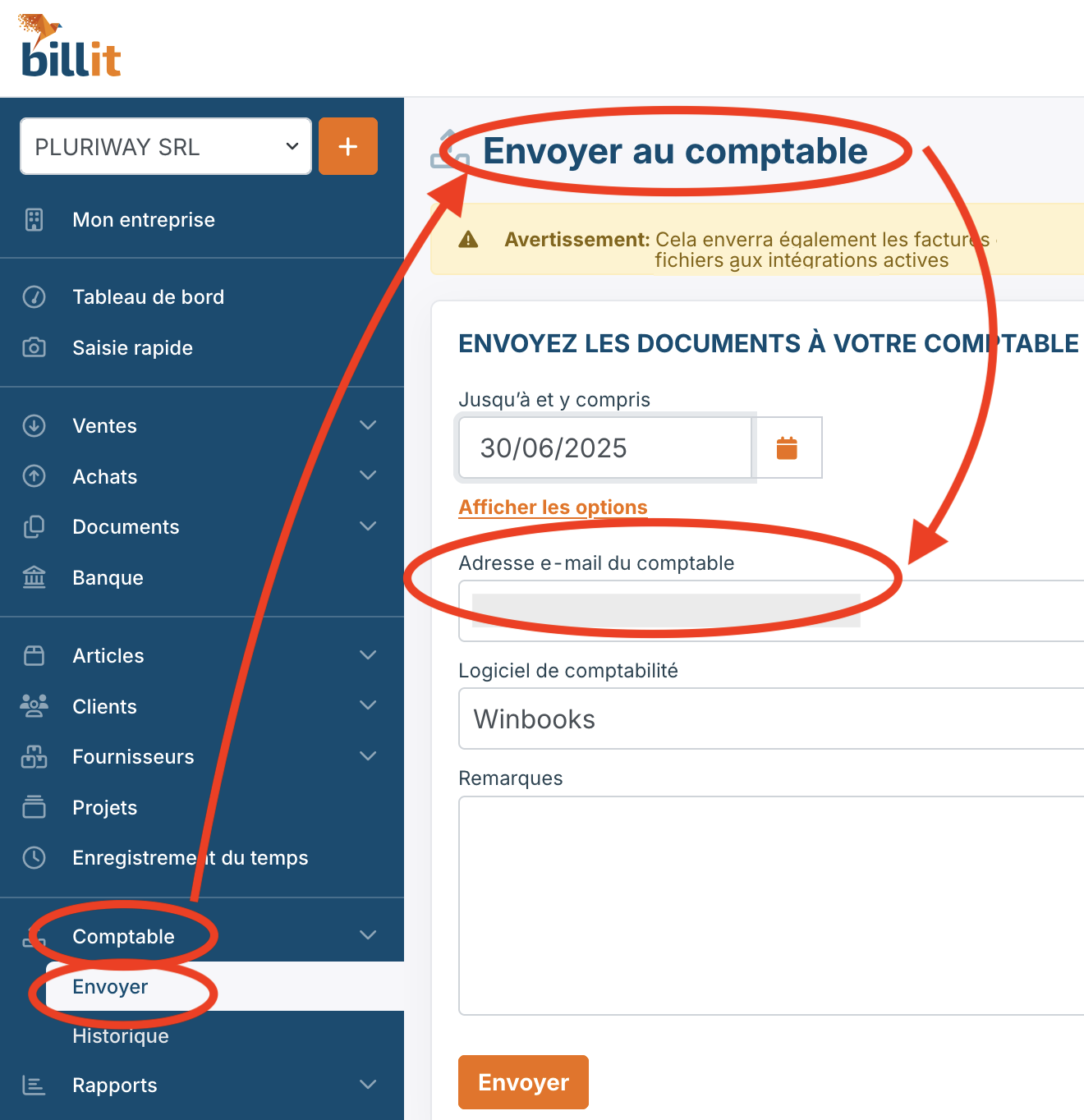 Vous demandez à Billit de vous envoyer un mail, comme si vous étiez le comptable, avec un lien qui vous permet de récupérer un fichier "zip" qui contient toutes les factures à comptabiliser.