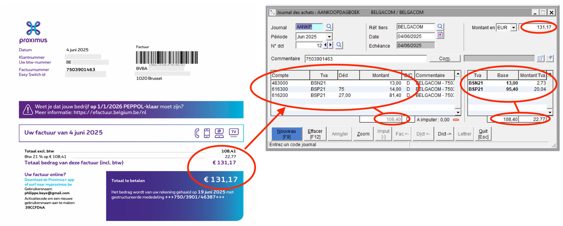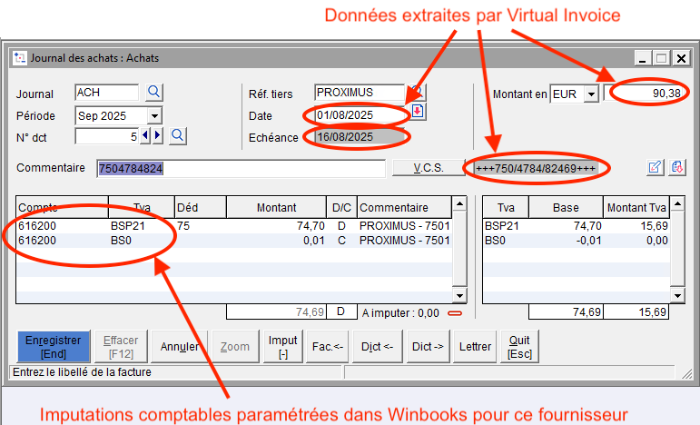 Virtual Invoice propose directement un encodage comptable dans Winbooks : date, n° de facture, référence du client, compte général, montant hors TVA, TVA à appliquer, échéance, etc tout en affichant le PDF d'origine !